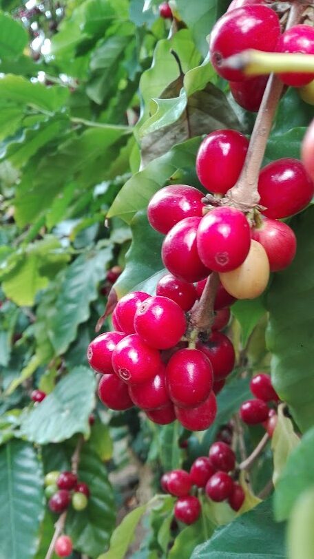 コーヒーの実の写真です。残念ながら当店ではないのですが、大村市の「寿古珈琲」で見学させてもらったものです。とっても綺麗で美味しそうな実ですね。好みの中にある種が珈琲になります。実はコーヒーは豆ではなく種なんです。いつか私のコーヒーの木もこんな立派な実を付けてくれるのでしょうか?大切に育てておりますが今回の寒波は心配でした。 寒さで枯れないかなって。 始めて育てた時は夜寝るときや、家を空けるときは寒くならないように過保護に育ててあげました。5本くらいあったコーヒーの木は現在2本。「この2本は絶対枯らさないぞ」と愛情を注いでおります。