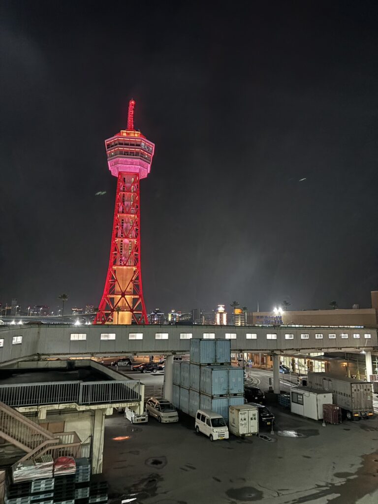 写真はフェリーから見た『博多ポートタワー』です。高さは100M、地上70Mの展望台は無料で登れますよ。ちなみに通天閣の設計と同じ内藤多仲氏による設計です。昭和39年10月にOPENしました。