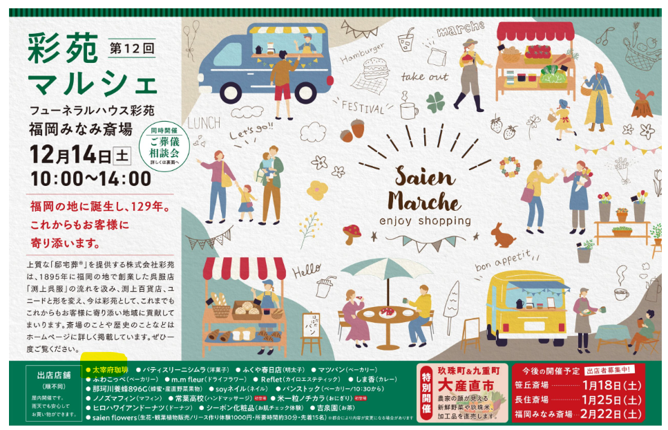 出店者は須玖北の『パティスリーニシムラ』綺麗で美味しい洋菓子、宝町交差点の『ふくや春日店』明太美味しいです。六本松より『マツパン』ハード系のパンが人気かも。大池通、サニー野間店向かい『ふわこっぺ』、ドライフラワー屋さん『m.m fleur』、『Reflet』、糸島市のスパイスカレー『しま香』、『那珂川養蜂896G』、『soyネイル』、箱崎の有名なパン屋さんですよね?『パンストック』明太フランスパン人気のはず。パティスリーニシムラを通り過ぎて100Mほどの距離です『ノノズマフィン』。筑紫野市の高校『常葉高校』何を出すの? 博多区のおにぎり屋さん『米一粒ノチカラ』。小笹の交差点より30M位の好立地『ヒロハワイアンドーナツ』美味しそう。『シーボン化粧品』、黒木瞳の出身地より『吉泉園』美味しいお茶ありました。彩苑さんの花屋さんらしい『saien flowers』20年の歴史があるらしい。その他に玖珠町&九重町の「大産直市」があります。